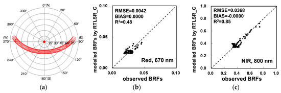 The best hotspot parameters of the hotspot reflectance height (C1) and width (C2) in the RTLSR_C model at several typical bands have been given based on a wide search from sufficient hotspot observations of POLDER [53], and the average optimal hotspot parameters in the red band (C1 = 0.5, C2 = 3.4°) and NIR band (C1 = 0.5, C2 = 3.0°) were used in model inversion. By inputting multiangle reflectances to the model, the three weight coefficients of fiso, fvol, and fgeo can be determined where the fitting RMSEs between the observed and modelled multiangle reflectances achieve the minimum, such as the global MODIS BRDF parameter products [22,23]. Subsequently, directional reflectance at arbitrary solar-view orientations can be simulated.