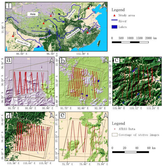 Location of study area and the distribution of satellite laser footprints: (I) location of 5 study areas, (a–e) is the distribution of ATL03 footprints in study area A to study area E, as described in Table 1.