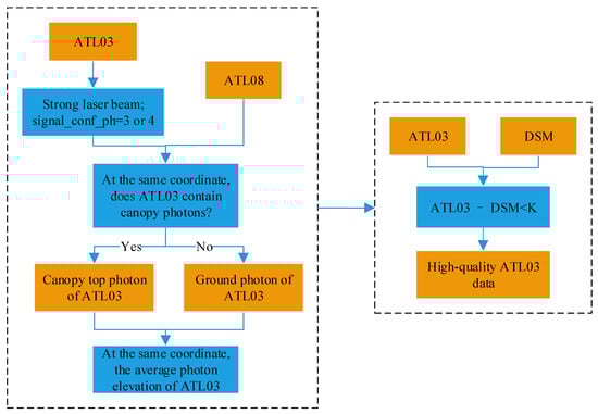 The ICESat-2 laser altimetry data are affected by factors such as terrain, collection time, clouds, and aerosols. The vertical accuracy of the laser point is not stable, and there are data points with large errors. Therefore, it is necessary to preprocess ATL03 before registration starts to eliminate incorrect data. The ATL03 data preprocessing process is shown in Figure 3, which specifically includes the following steps.