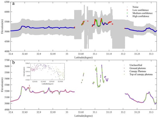 As shown in Figure 4b, combined with the ATL08 data [42], the filtered ATL03 photons could be classified into noise, terrain photons, vegetation canopy photons, and canopy top photons [43]. Since there were multiple types of photons at the same horizontal coordinate and the same type of photons was not unique, it was necessary to screen the classified photons so that only one type of photon remained at each horizontal coordinate. At this time, it was divided into two cases for processing. If the remaining photons included canopy top photons, the terrain and vegetation canopy photons were eliminated; if the remaining photons did not contain vegetation canopy photons and canopy top photons, the original terrain photons were retained. Finally, the average elevation value of the remaining photons was taken as the only elevation here.