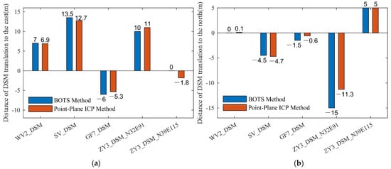 By comparing and analyzing the movement vector of the DSM center in the horizontal direction when the ICP algorithm and the BOTS algorithm were registered, the effect of the algorithm based on terrain similarity (BOTS) was evaluated. Table 3 counts the translation of these two methods of the DSM center in the east and north directions and counts the translations of the difference. For WV2_DSM, SV_DSM, and GF7_DSM, it can be seen that, after being optimized by the two algorithms, the translational difference between the east and north directions of the DSM center reached the submeter level, which was less than the DSM’s spatial resolution. For the two ZY3_DSM data sets, the difference between the translational amount of the DSM center in the east and north directions was greater than 1 m, which was still less than the spatial resolution of the DSM (2.5 m). When the allowable error was less than one pixel, the results of the BOTS algorithm and the ICP algorithm showed a high degree of consistency. Figure 8 shows the spatial distribution of the translational amount of the DSM center after the BOTS algorithm and the ICP algorithm were used for registration optimization.
