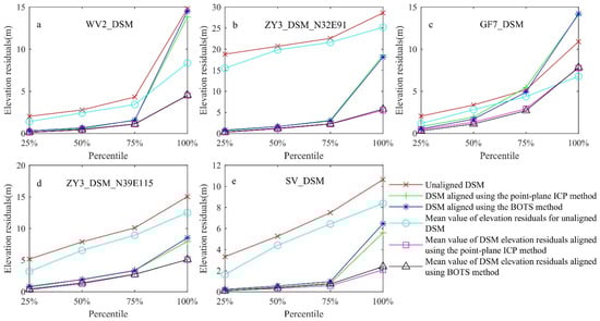 In Figure 9a–e, two registration algorithms were used to calculate the absolute value of the elevation residuals and the average of the absolute values of the elevation residuals of the five DSMs at each percentile. Figure 10 shows the spatial distribution of elevation checkpoints in each DSM. In general, the elevation residuals of the five DSMs optimized by the two registration algorithms were greatly improved. In the 0~75% percentile of the DSM elevation residual, the residual variation was small, indicating that the distribution of the elevation residual was concentrated. In the 75~100% percentile, the elevation residual changed greatly and the elevation residual distribution was discrete, indicating that the elevation residual in the 75~100% percentile contained abnormal data. The absolute value of the elevation residual and the absolute average value of the elevation residual calculated by the two matching algorithms were close to each other, indicating that the BOTS algorithm can achieve the same accuracy as the ICP algorithm in the vertical direction.