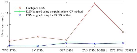 Figure 10 visually compares the RMSE values of the DSM elevation residuals before and after the optimization of the two registration algorithms for each DSM. In the vertical direction, the elevation residual RMSE calculated by the BOTS algorithm had a clear advantage over the unregistered elevation residual RMSE. Due to the different imaging conditions of each stereo pair, the optimized amplitudes of the five DSMs were different.