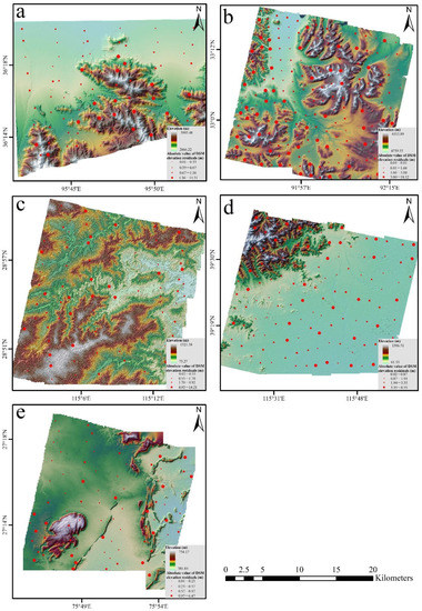 Figure 11a–e show the spatial distribution of the absolute value of the elevation residual after optimization of WV2_DSM, ZY3_DSM_N32E91, GF7_DSM, ZY3_DSM_N39E115, and SV_DSM based on the terrain similarity (BOTS) DSM registration algorithm. The checkpoints were evenly distributed on each DSM, which ensured the reliability of the DSM elevation accuracy analysis. The checkpoint distribution is shown in Figure 11; the red dot is the position of the checkpoint. The size of the red dot represents the error value; if the point is larger, the error is bigger. The DSM elevation optimization results were greatly affected by the terrain, the type of land cover, and the spatial resolution of the DSM. The points with large elevation residuals in each DSM were mostly distributed in areas with steep terrain and vegetation coverage, while the flat areas had smaller elevation residuals.