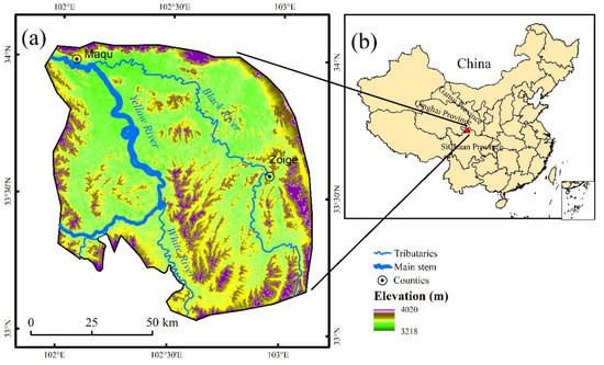 The Zoigê area is located in the eastern part of the Qinghai–Tibetan Plateau. It is an important component for maintaining the plateau ecosystem and global climate and plays an important role in water conservation and ecological balance [19,20]. Human activities and global climate change have had an impact on the hydrology of this fragile ecological environment [21]. In the last few decades, the Zoigê area has experienced a remarkable reduction in surface water, transforming many swamps into terrestrial grasslands [20,22].