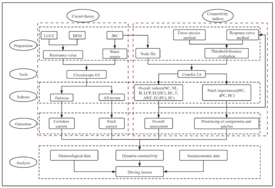 Circuit theory was used to reveal landscape scale hydrological connectivity, while connectivity indices were used to quantify hydrological connectivity at a patch scale. Water bodies larger than 10 ha in the JRC data were used as the source data for circuit theory-based analysis. The LUCC and DEM data were used in conjunction with each other to determine a resistance value. The pairwise and all-to-one modes in Circuitscape 4.0 were then used to obtain current maps for the corridors and patches, respectively. For the calculation of the connectivity indices, the node file used the same JRC data, with the threshold distance determined according to the focus species and response curve methods. All connectivity indices were calculated in Conefor 2.6 [28]. The overall assessment was determined by calculating selected indices, namely the Number of Components (NC), the Number of Links (NL), the Harary index (H), the Landscape Coincidence Probability (LCP), the Integral Index of Connectivity (IIC), the Flux (F), the Area Weighted Flux (AWF), the Probability of Connectivity index (PC), the EC (IIC), and the EC (PC). The EC (IIC) and EC (PC) were computed as the square root of the numerator of the IIC and PC, respectively. Overall indices were also used to fit a response curve. The prioritization of components and patches were determined according to indices of patches, including dIIC, dPC, and Betweenness Centrality (BC). The dIIC and dPC were determined by removing individual patches from the landscape and quantifying the corresponding decrease in connectivity. The calculation of these indices can be referred to Appendix D. Finally, we evaluated the driving factors of dynamic connectivity according to meteorological data and socioeconomic data. The specific method was shown in Figure 2.