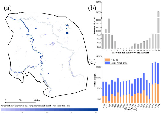 Distribution of surface water in the Zoigê area. (a) Spatial pattern of potential surface water habitats, (b) Interannual pixel count for surface water, (c) Area statistics for surface water.