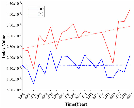 Changes in hydrological connectivity (IIC and PC) of Zoigê area at a distance of 300 m, from 2000–2019.