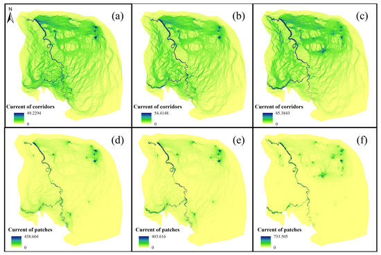 Current distribution maps for the Zoigê area from 2000 to 2019. (a) Current of corridors in 2000, (b) Current of corridors in 2010, (c) Current of corridors in 2019, (d) Current of patches for 2000, (e) Current of patches for 2010, and (f) Current for patches in 2019.