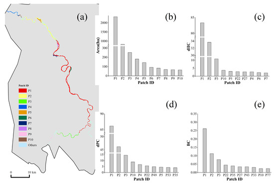 As C1 in each year was considered the most important component for the total hydrological connectivity, we used the same indices to identify the importance of the patches in the C1 component and arrange them in descending order in accordance with the size of the area (viz. P1, P2, P3, etc.). The C1 component was composed of 56, 79, and 99 patches of surface water (Figure A3a, Figure A4a and Figure 8a). Of these patches, the most important patch in each year was P1, which had the largest values for area, dIIC, dPC, and BC (Figure A3b–e, Figure A4b–e and Figure 8b–e). In terms of temporal variation, the area dIIC and dPC of P1 first decreased and then increased, indicating that the contribution of P1 to maintaining and improving regional connectivity first decreased and then increased, with the steppingstone function of P1 first increasing and then decreasing. C1 was the most important component in the study area. We further evaluated the important patches of surface water in C1. When the various indices for the patches were within 10% of this year, these patches were considered the most important patches. Therefore, the most important patches in 2000 were P1, P2, P4, and P6. In 2010 the most important patches were P1, P2, and P3. Lastly, the most important patches in 2019 were P1, P2, P3, and P10.