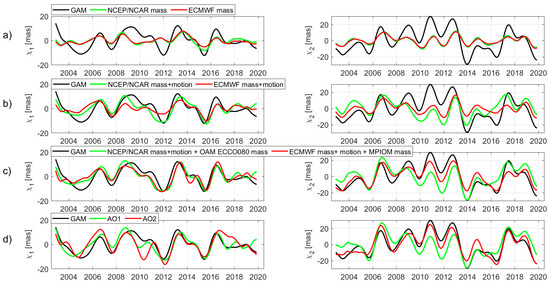 (a) Monthly interannual excitations of geodetic GAM excitations and different combinations of geophysical mass and motion terms of and components (AO1, AO2): (b) GAM vs. AAM NCEP/NCAR and AAM ECMWF of their mass components, (b) GAM vs AAM NCEP/NCAR and AAM ECMWF of their mass + motion components, (c) GAM vs. AAM NCEP/NCARmass+motion + OAM ECCO 080mass and AAM ECMWFmass+motion + OAM MPIOMmass components, (d) GAM vs. AO1 = NCEP/NCARmass+motion + OAM ECCO 080mass+motion, and AO2 = AAM ECMWFmass+motion + OAM MPIOMmass+motion geophysical excitations.