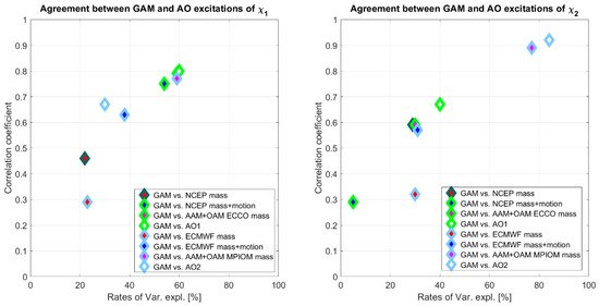 For identical time series, rates of variance equaled , and for time series not fitting at all it might be even negative. For equatorial components, a better correspondence of AO2 series with the observed GAM excitations was found, over AO1 excitations, whose rates of explained variance reached , and the correlation coefficient was equal to 0.92 (the highest among all the considered geophysical excitations). However, the agreement between GAM and AO1 excitations for was better than for AO2 excitations. Compared to the RMS of full excitations, both the matter and motion terms of the atmospheric and oceanic effects are important and have different impacts on interannual PM excitations. Despite these promising results, it was not possible to find a conclusive indication of which combination of AAM and OAM is the best to explain GAM excitations.