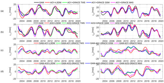 Comparison between observed geodetic excitation functions and (a) monthly geophysical excitations for AO1 improved by HAM LSDM hydrological model, GRACE GSM, GRACE TWS, and GRACE MAS gravimetric excitations; (b) monthly geophysical excitations for AO2 improved by HAM LSDM hydrological model, GRACE GSM, GRACE TWS, and GRACE MAS gravimetric excitations; (c) differences between GAM and the sum of AO1 + HAM; and (d) differences between GAM and the sum of AO2 + HAM, for and equatorial components.