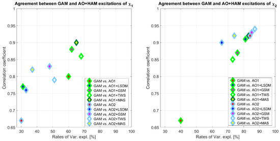 Additionally, the rates of variance explained and the correlation coefficients between geodetic GAM and geophysical excitations improved by the HAM excitations are computed and presented in Figure 6. The improved correlation between geodetic time series and geophysical ones is due to the component of PM. The AO2 + GRACE TWS time series correlate with the GAM excitations to a level of , and explain the GAM interannual oscillations in . For the component, other geophysical excitations computed for the AO2 combination better explain GAM excitations than the AO1 combination. In the case of the component, the improved completeness is between GAM and AO1 + GRACE GSM, AO1 + GRACE TWS, and AO1 + GRACE MAS. However, the rates of variance explained reached the highest value of for the AO1 + TWS combination, and the correlation coefficient was found to be the best for AO1 + GARCE MAS excitation at .