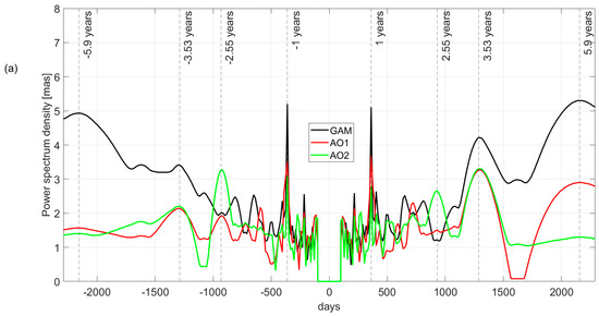 To understand and quantify interannual oscillations for the observed GAM and geophysical excitations, a linear trend was removed from all the time series using unweighted least squares, and then Fourier spectral analyses (FTBPF Fourier Transform Band Pass Filter, [55]) were performed to identify dominant periods of variation. The spectra of the complex-valued components of for the GAM and geophysical excitations AO1 and AO2, improved by HAM excitations, are shown in Figure 7a–c. These spectra were computed using Fourier Transform Band Pass Filters (FTBPF; [55]) with a 50- and 4500-day cutoff.