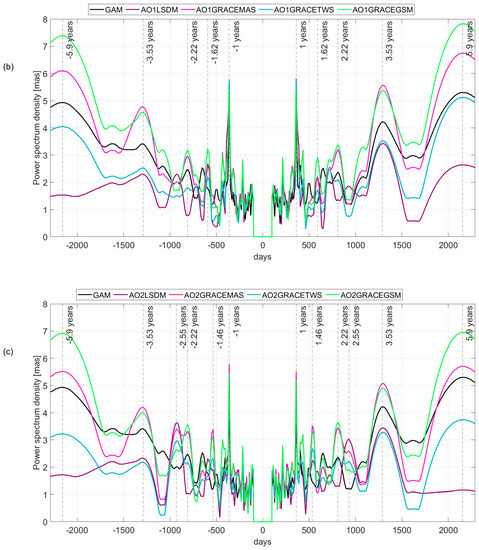 Considering the influence of land hydrology on geophysical AO1 and AO2 excitations, a geophysical signal power amplification for AO1 + HAM and AO2 + HAM was generally found. The power of the prograde and retrograde oscillations increased, especially after adding the influence of gravimetric excitation functions from GRACE data (Figure 7b,c). However, when using the HAM LSDM hydrological model for this purpose, the -year peak did not appear. For the GRACE GSM and GRACE MAS excitation functions, the signal for the - and -year oscillations was overestimated in contrast to geodetic observed GAM excitations, both in the prograde and retrograde components.