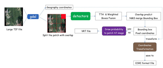 The real-world inference pipeline of our disease detection system is demonstrated in Figure 6. The UAV with an RGB camera first captured an overlapped image in the survey area. We then processed these images and integrated them into a large orthophotograph. The geographic coordinates are possibly varied due to changes in camera distance, so they had to be carefully recorrected for each object to be kept in its proper position. The resulting 8-bit “*.tif” image was further processed by the GDAL (https://gdal.org, accessed on 20 December 2021) library and cropped into 800 × 800 patches with overlap. The overlap is essential because the boundary region of the patch has few context information which leads to wrong detection results. We then located the presence of disease in each patch and indicated their location with a bounding box through the inference process.