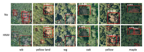 Figure 8 shows some examples of the stark contrast that occurred when we applied finetuning with six “disease-like” categories. HNM successfully suppresses the confidence score of ambiguous objects while locating real disease well. The “wb” category (first column) signifies no PWD-infected dead trees; “wb” and PWD-infected dead trees differ only slightly in the branches. Including “wb” reduces the number of FP bounding boxes and possibly well guides the network to update the network for real PWD-infected dead tree by lowering the confidence score of FPs. Moreover, low-resolution images leads to confusion in identifying the yellow land and small PWD objects. The new category “yellow land” alleviates the effect of ground (confidence score 0.960 –> 0.003 in column (2)). The same phenomenon happens with the “maple” category. Due to the loss of water in the late disease stage, PWD-infected trees tend to show a red-brown color, thus appearing similar to maple trees. Without HNM, the network predicted maple trees (column 6, first row) as PWD-infected disease (high confidence score), but including the additional maple samples promoted the learning ability to filter errors (confidence score 0.893 –> 0.630).