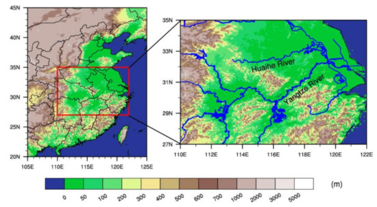 Location of the Yangtze–Huaihe River Valley (110–122° E, 27–35° N) in eastern China and its topography (color shading represents elevation).