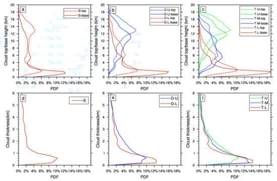 Probability density functions (PDFs) of cloud-top height (solid lines), cloud-base height (dashed lines) and cloud thickness for (a,d) single-layer clouds, (b,e) double-layer clouds, and (c,f) triple-layer clouds. The letters in the legends indicate different cloud layers. S, D, and T denote single-, double-, and triple-layer clouds, respectively. U/M/L represent the upper/middle/lower layers in multi-layer cloud systems.