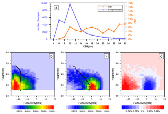(a) Sample number (blue line) and probability of precipitation (orange line) as a function of the cloud effective radius. Normalized contoured frequency by altitude diagrams of radar reflectivity for single-layer water clouds for (b) non-precipitating clouds, (c) precipitating clouds, and (d) their differences (non-precipitating clouds minus precipitating clouds). The black lines in parts (b) and (c) are the mean vertical profile of reflectivity for non-precipitating clouds and precipitating clouds, respectively. CER = cloud effective radius; POP = probability of precipitation.
