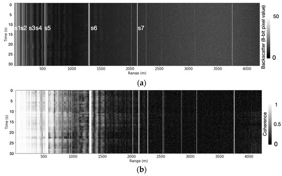 Stare-mode acquisition acquired 4 March 2020 and derived backscatter (a), coherence (b) and interferometric phase (c). Strong scatterers s5–s7 can be identified in (a). σ0 is not calculated in (a) as absolute calibration was not performed.