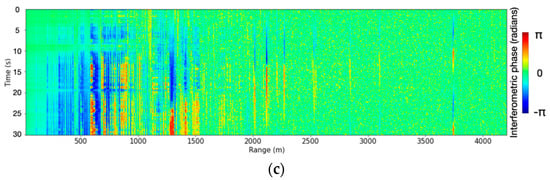 The corrected Figure 7, “Stare-mode acquisition acquired 4 March 2020 and derived backscatter (a), coherence (b) and interferometric phase (c). Strong scatterers s5–s7 can be identified in (a). σ0 is not calculated in (a) as absolute calibration was not performed.”, appears below.