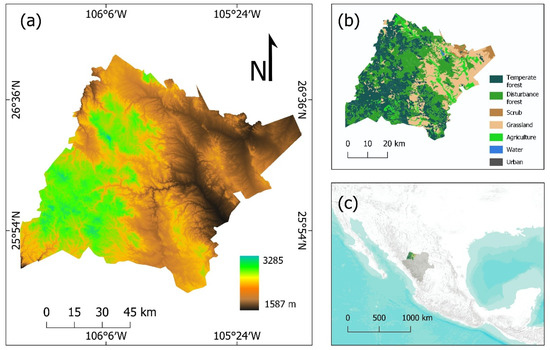Study area. (a) Elevation; (b) Vegetation. The data on land use and vegetation were taken from information from the National Institute of Statistics and Geography of Mexico [50]. Temperate forests include pine forests, oak forests, and mixed forests. The disturbance forest classification corresponds to forests that suffered some alteration and are under a natural regeneration process; (c) Location of study area.