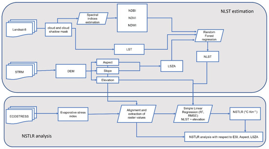 where NLST is LST modeled based on the surface biophysical characteristics and solar incidence angle, is non-linear linking model. Random Forest regression method was used to build the non-linear linking model between LST obtained and the predictors (NDVI, NDBI, NDWI and LSZA). Finally, NSTLR was calculated by a simple linear regression between NLST (dependent variable) and DEM (independent variable), where regression slope represents the NSTLR value [8,33].