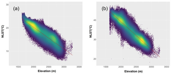 Point density plots of elevation (meters above sea level) against Normalized Land Surface Temperature at two seasons (a) winter and (b) summer. The red line is the linearly fitted line.