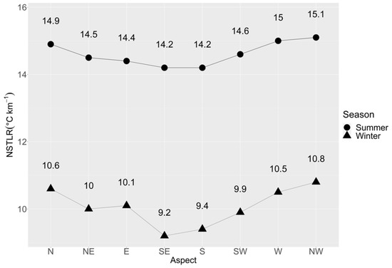 The aspect was an important characteristic for the NSTLR values, it had higher values in the Northwest aspect of the two seasons studied (winter and summer). In the north hemisphere, southern and eastern aspects generally present a more homogeneous temperature through the altitudinal gradient. That agrees with, Liu and Li [76] in a study in China mountains where observed a higher NSTLR in North and West aspects, which are opposite to solar radiation direction. Aspect plays a key role in thermal processes in mountain areas; the higher NSTLR observed for N and NW aspects for both seasons might be related to a non-homogeneous heating process in aspects opposed to solar radiation, as opposed to a more homogeneous heating in aspects oriented towards solar radiation (i.e., S and SE) [18]. In the north hemisphere, southern and eastern aspects generally present a more homogeneous temperature through the altitudinal gradient.