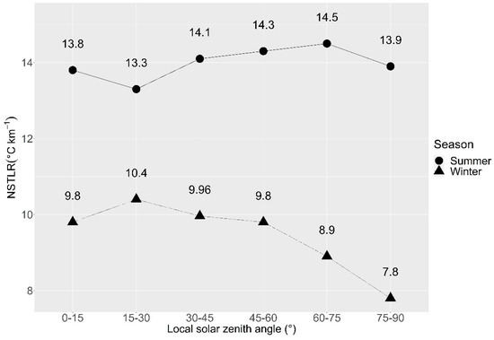 We utilized the LSZA equation to quantify the effect of solar position on the terrain slope at acquisition time, since the solar position changes the angle and intensity of the solar energy above the terrain [65,66]. NSTLR decreased with increasing LSZA for both seasons, possibly caused by a less direct impact of sunlight at higher LSZA, with a difference between seasons of more than 5 °C km−1 (Figure 6).