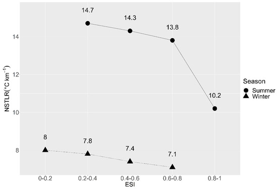 NSTLR against ESI ranges are shown in Figure 7. Observed ESI ranges were 0.2–1 for summer and 0–0.8 for winter (Figure 7). Observed NSTLR in our study was lower in areas with higher ESI for both seasons. These results suggest that areas with the higher water availability have lower thermal gradients and this effect is stronger in summer season.