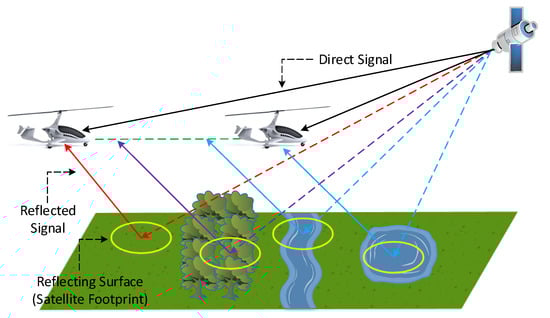 Global Navigation Satellite Systems-Reflectometry (GNSS-R) is an emerging bistatic remote sensing technique that uses the GNSS signals (mainly GPS signals) as sources of opportunity to characterize Earth surface. GNSS systems continuously transmit signals to Earth surface at different L-bands ranging between 1 and 2 GHz. A GNSS-R sensor receives the direct GNSS signals from the satellites as well as those reflected from the Earth’s surface. The reflected signals carry information about the reflecting surface, such as its height, shape, and moisture content. The reflecting surface can be an ocean, in which case, the sea level altimetry [11,12], wind speed [13,14], and ocean salinity [15] can be estimated, or land for studying the cryosphere including snow depth estimation [16,17] and sea ice detection [18,19], or for estimating the soil moisture content [10,20] and vegetation biomass [21].