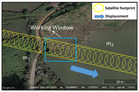 We can observe in Figure 4 that when the mean value of the GNSS signal amplitude is equal to , the ellipse is on the first area (land), and when the mean value of the GNSS signal amplitude is equal to , the ellipse is on the second area (water body). We observe that at the border between different areas of reflection, the change in the signal level is not abrupt but rather transitional. That is why a transition model is adapted to characterize the changes in the amplitudes of the reflected GNSS signals. We assume that the GNSS measurements are piecewise stationary and the noise on the observations are additive, Gaussian and centered. The increasing evolution of the signal model between the mean values and in Figure 4 models a linear transition from a surface of low reflectivity (land) to a surface of higher reflectivity (water body). We define in Section 4.3 the start and end instants of the working window in order to optimize the estimation.