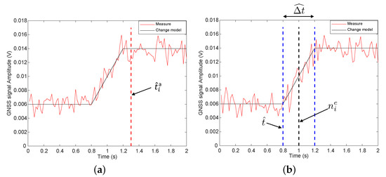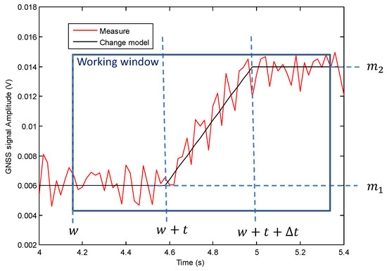According to the signal model of Figure 4 and assuming that the noise is additive, white-centered, and Gaussian, we derive a maximum likelihood estimate of t, the starting instant of the transition and , the duration of the transition. The estimates are processed with the GNSS signal amplitudes observations in the working window . The GNSS amplitude observations are obtained from the in-phase observations [44]. is the localization of the change for satellite l and is the detected change instant provided by the CUSUM detector for satellite l. In the rest of the section, we will note as and as to simplify notations. N is the number of samples in the working window defined between , the previous localized change by MLLE and , the next detected change by CUSUM.