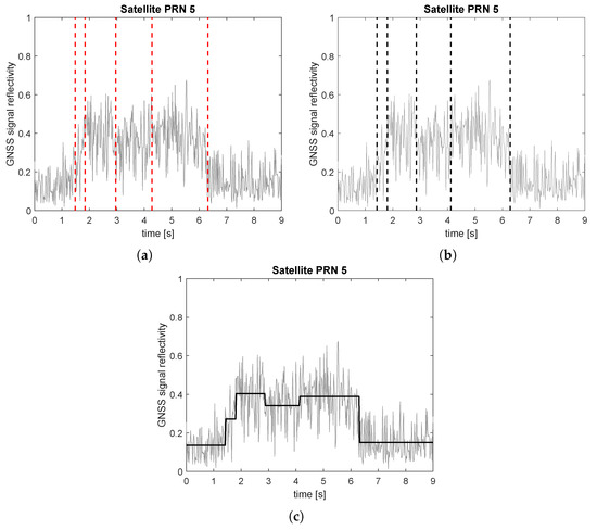 We show in Figure 9 the reflectivity measurements obtained with our GNSS-R receiver embedded on a gyrocopter. The surface reflectivity increases with the water content of the soil. Figure 9 shows the changes in the signal reflectivity associated to the reflections from land and from water bodies. In order to detect and localize water bodies, we apply an automatic segmentation of the signal using the reflectivity measurements based on the change detection and localization algorithms presented in the previous sections. Firstly, the changes in the reflectivity of the GNSS signal are detected with the Kalman-CUSUM algorithm (Figure 9a). Then, these changes are localized using the proposed MLLE approach (Figure 9b). Finally, the signal is divided into different segments associated to different mean reflectivity levels based on the localized change positions (Figure 9c).