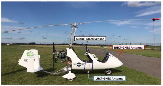 An RHCP antenna is fixed on the nose of the gyrocopter pointing towards the zenith and an LHCP antenna is mounted on the bottom of the gyrocopter pointing towards the nadir. A drone board sensor records the receiver’s attitude, altitude and position with respect to the GPS time. In addition to the on-board sensors, the gyrocopter was loaded with the necessary setup that constitute the GNSS-R receiver hardware for data collection. This receiver is composed of a delay line, combiners/splitters and a Syntony L1-L5 bit grabber for digitizing the composite signal.