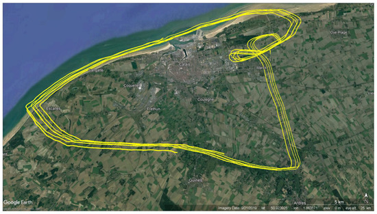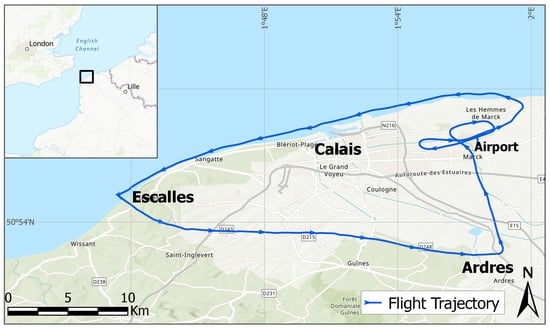 The gyrocopter took off from Calais–Dunkerque Airport located in Marck, 7 km east-northeast of Calais, in the Hauts-de-France region. We scanned a large zone that borders the English Channel over a trajectory of ∼71 km between Calais, Escalles, and Ardres. This study area was selected for experimentation because it contains a number of different landforms. The topography of the study area, especially the region between Guînes and Ardres, does not vary a lot as it only contains plain land, water bodies, and some forests with no landscapes that might hugely affect the topography of the surface (such as mountains or big hills). This specific region holds over 50 different water body surfaces (such as lakes, ponds, rivers, swamps, etc.) of different nature and sizes. The effects of the study area surface roughness on the reflectivity measurements are not taken into consideration since we aim for the detection and localization of in-land water body surfaces using the variations of the measurements as we obtain reflections from different landforms along the trajectory rather than its estimated value. The flight trajectory and study area are shown in Figure 11.