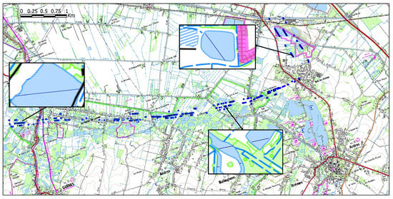 The detected water body surfaces using our proposed radar technique for the area between Guînes and Ardres. The specular points of reflection, represented by a blue coloring, are superimposed on IGN maps.