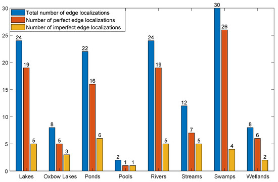 We can also observe in the histogram of Figure 16, a comparison of the number of perfect and imperfect localizations with respect to the total number of water body edge localizations per type. We notice from the second column of Table 4 and from Figure 16 that swamps had the highest localization accuracy with (26 perfect localizations out of 30) followed by lakes and rivers with an accuracy of for each with the same number of detections. The pool had the lowest edge localization accuracy with but from just 2 measurements. Streams/brooks noted the second lowest edge localization accuracy with from 12 localizations.
