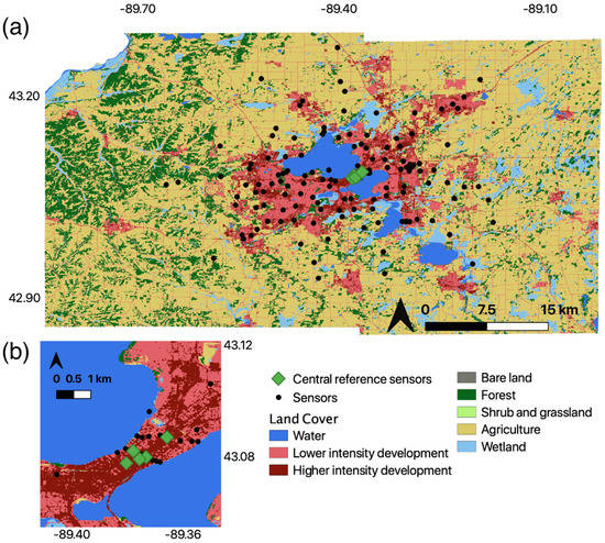 Maps of land cover over (a) the entire study area (Dane County, Wisconsin), and (b) downtown Madison. Locations of all stationary air temperature/relative humidity sensors are indicated with black dots. Green markers indicate the locations of the five sensors used as central reference points.
