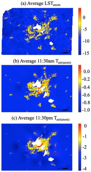 (a) LST, (b) 11:30 a.m. Tair, and (c) 11:30 p.m. Tair anomalies at 400-m resolution, averaged over the 15 dates studied. Temperatures of the lakes (in white) are masked out.
