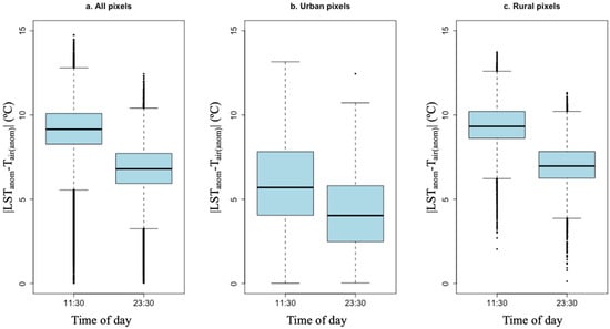 The magnitude of difference between Tair(anom) and LSTanom varied by time of day and between rural and urban settings (Figure 3). Across all pixels, the difference between surface and air temperatures was greater during the day than at night (p < 0.001). This smaller difference at night than during the day held true for both urban (Figure 3b) and rural (Figure 3c) settings (p < 0.001 for both cases). In addition to this disparity between day and night, the difference between Tair(anom) and LSTanom was lower for urban pixels than rural ones, at both 11:30 a.m. (p < 0.001) and 11:30 p.m. (p < 0.001).