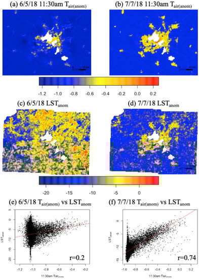 On both 5 and 7 July 2018, the scatterplot between 11:30 a.m. Tair(anom) and LSTanom displays an artifact of the regression kriging; rural points that shared the same covariate values and were all substantial distances from the sensor network all share the same predicted Tair despite differing in LST, producing the vertical lines seen in Figure 4e,f. This artifact does not obscure the fact that there was a stronger linear relationship between 11:30 a.m. Tair(anom) and LSTanom on 7 July 2018 than there was one month earlier. The pattern of lower correlation on 5 June 2018 and higher correlation on 7 July 2018 was not limited to the comparison between LSTanom and 11:30 a.m. Tair(anom). This trend was also evident in comparisons between day and night Tair(anom). On 6–7 July, the correlation between 11:30 a.m. and 11:30 p.m. Tair(anom) was 0.79, while the same comparison for the 4–5 June scene had an r-value of just 0.37.