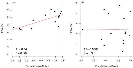 RMSE plotted against correlation coefficient for (a) the relationship between LSTanom and 11:30 a.m. Tair(anom) and (b) the relationship between 11:30 p.m. Tair(anom) and 11:30 a.m. Tair(anom).