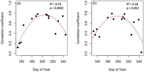 Correlation between LST and 11:30 a.m. Tair was lowest at the beginning and end of the summer, peaking in late July. Some summer weeks were represented more frequently than others; for example, four scenes from the last week of July were included, but no scenes between 14 and 28 June or between 1 and 12 August were suitable for analysis. Despite these gaps, a parabolic curve (R2 = 0.76, p = 0.0002) was fit to the relationship between the day of the year and the correlation between LSTanom and 11:30 a.m. Tair(anom) (Figure 6a). The correlation coefficient between 11:30 a.m. Tair(anom) and 11:30 p.m. Tair(anom) also followed a parabolic curve when plotted against the day of the year (Figure 6b), but the fit was weaker (R2 = 0.58, p = 0.002).