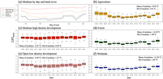 Over all 15 days, LST was consistently lowest for forest and wetland pixels and highest for medium- to high-density development. Lower intensity development was the second warmest category on every date other than 2 June 2017. On most days, median agricultural LSTanom was higher than the other two vegetated classes and lower than the two developed land categories, but the difference between agricultural LST and the four other land cover classes shifted throughout the summer season. Across the three early June dates, median LSTanom for agriculture fell within 1 °C of the median for open-low development, while over the latter half of the summer, median LSTanom values across agricultural land were closer to the medians for forest and wetland pixels than to the developed land categories (Figure 7a).