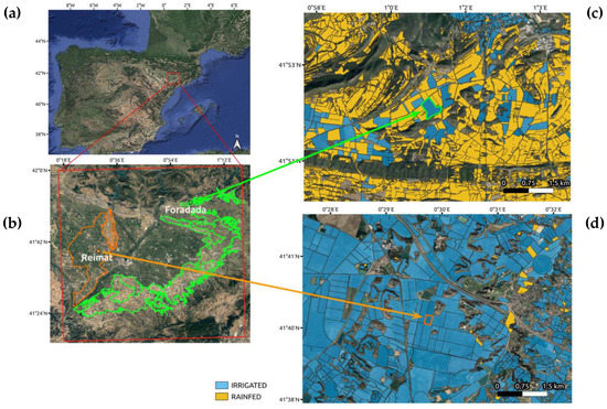 Study area considered. (a) General identification of the area located in Lleida’s region (Catalunya). (b) Segarra-Garrigues (green) and Aragó i Catalunya (orange) irrigation districts, and the location of the two studied fields. (c) Detailed map of the Foradada field. (d) Raimat field, highlighting the surrounding irrigated and rainfed fields from the SIGPAC database (http://sig.gencat.cat/visors/Cultius_DUN_SIGPAC.html, accessed on 15 September 2021).