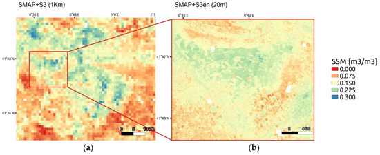 SSM map of the considered study area on 19 August 2017. (a) SMAP + S3 SSM map at 1 km resolution and (b) SMAP + S3en SSM map at 20 m resolution.